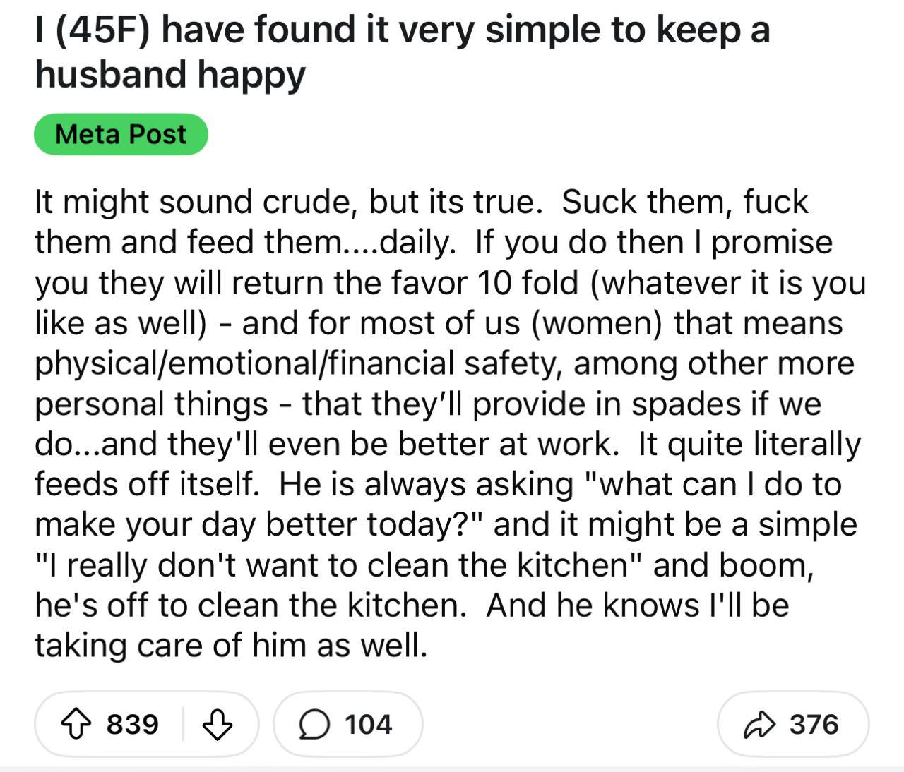 There are so many absolute wankers on Substack dispensing PUA style bullshit, random cat-ladies telling you how men are intimidated by strong independent wine-addled cat-ladies, and general noise that I have decided to give you all, WOMEN, the secret key to ensuring a permanent and loving relationship, absent of any religious morality (though in the REALLY long term, I strongly suggest you actually get some) or judgement of any kind. Merely the practical aspect (amoral as it is)1 that will ensure the relationship progresses nicely towards old age and mutual bliss.