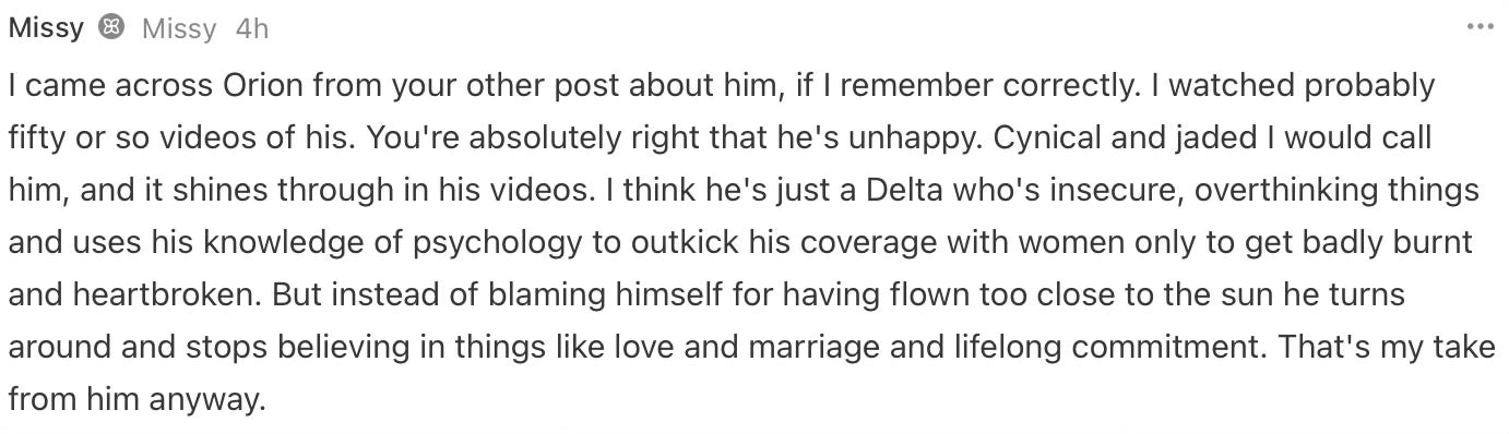 Missy (whom I appreciate as a reader as she invariably gives a very needed female perspective on things I write about) made the following comment, which, as my brain is won’t to do, sparked a whole host of various thoughts and pathways. the result of which is the post below the image of her comment. Before you get tot hat though, it may be useful for your own purposes to read some other posts I had done previously on the OG blog. While they are nominally also about Orion (so you can see my view of him has never really deviated) the purposes of them was really far more to give you useful tools to navigate the dating/relationship/marriage scene.