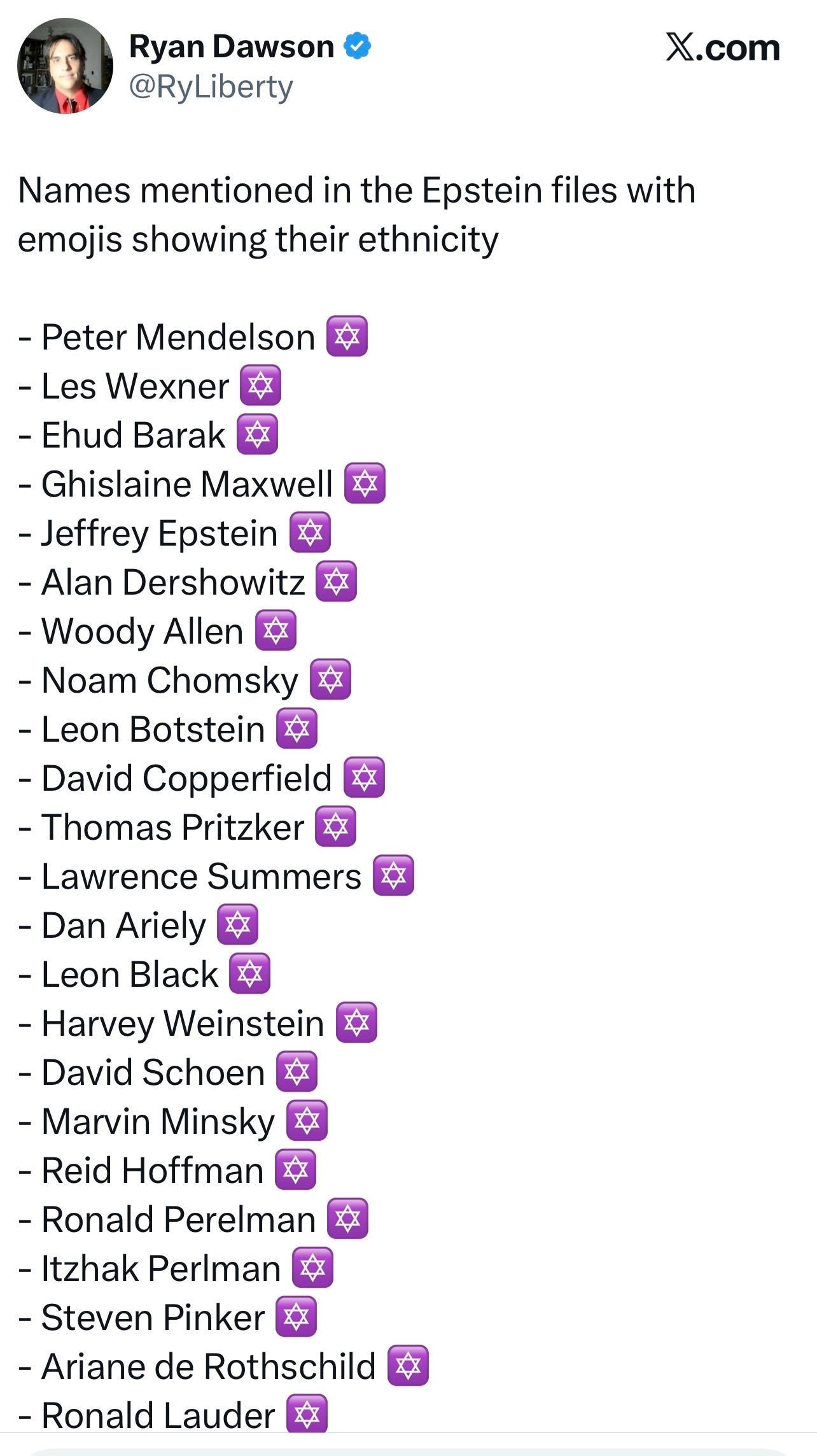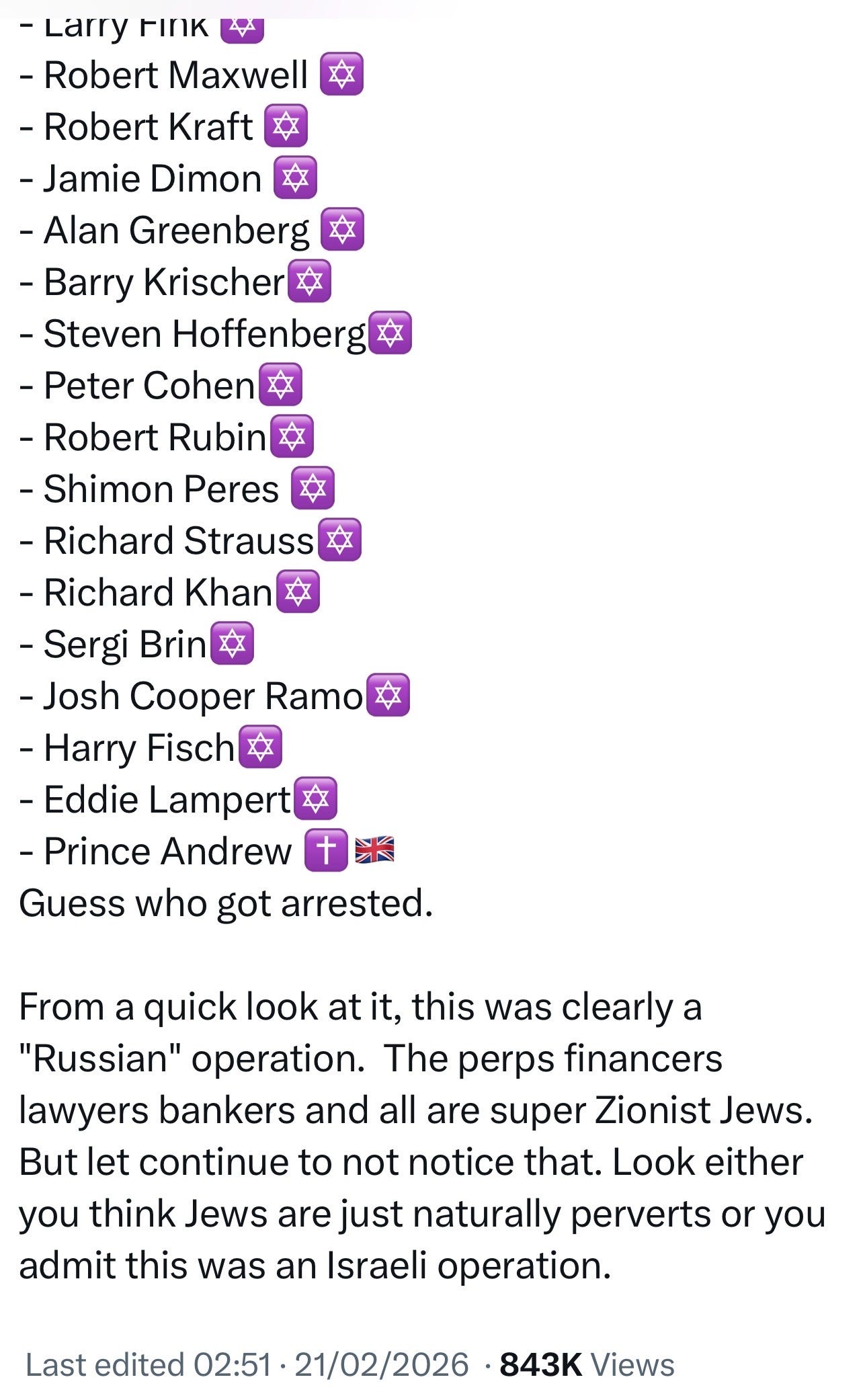 "Look, either you think Jews are just naturally perverts or you admit this was an Israeli operation." -- I will say how about both? Thanks, Kurgan, for posting these names in an easy to read format. It's nice to have the names of our satanic pedophilic ruling elite.