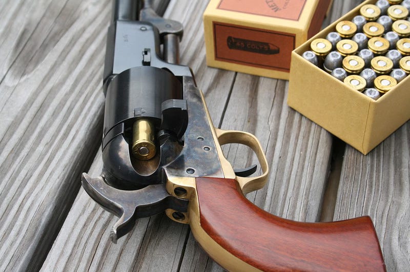 But as it happens, these revolvers were also shown in the comic as using the standard cartridges that most associate with single action revolvers. The problem is that the colt dragoons were black-powder weapons, so this would have seemed to be an error on the part of the writer of the comic book (and in fairness, it probably was).